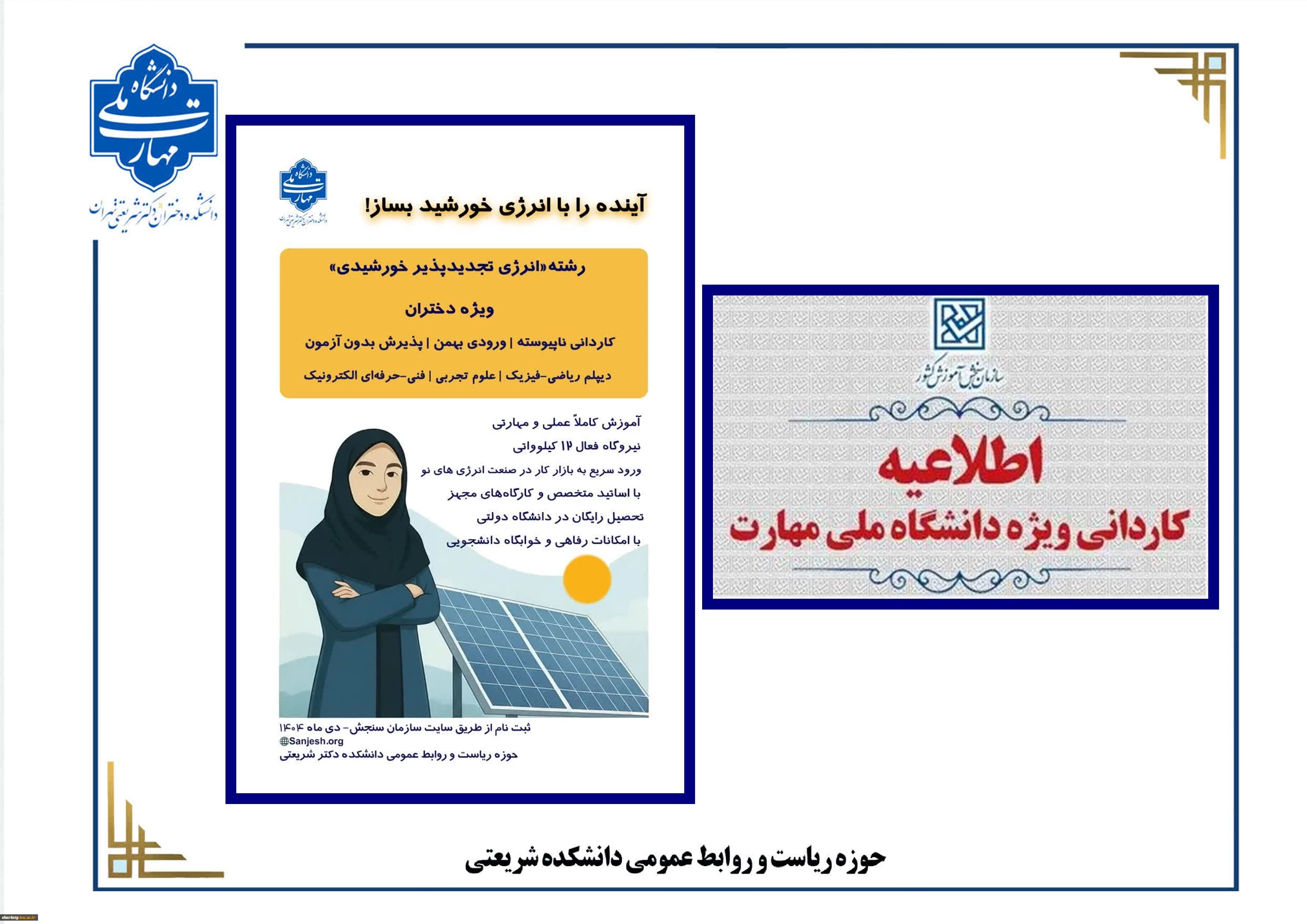 ثبت نام پذیرش بدون آزمون کاردانی انرژی تجدیدپذیر خورشیدی در دانشکده ملیمهارت شریعتی تهران ویژه دختران آغاز شد.