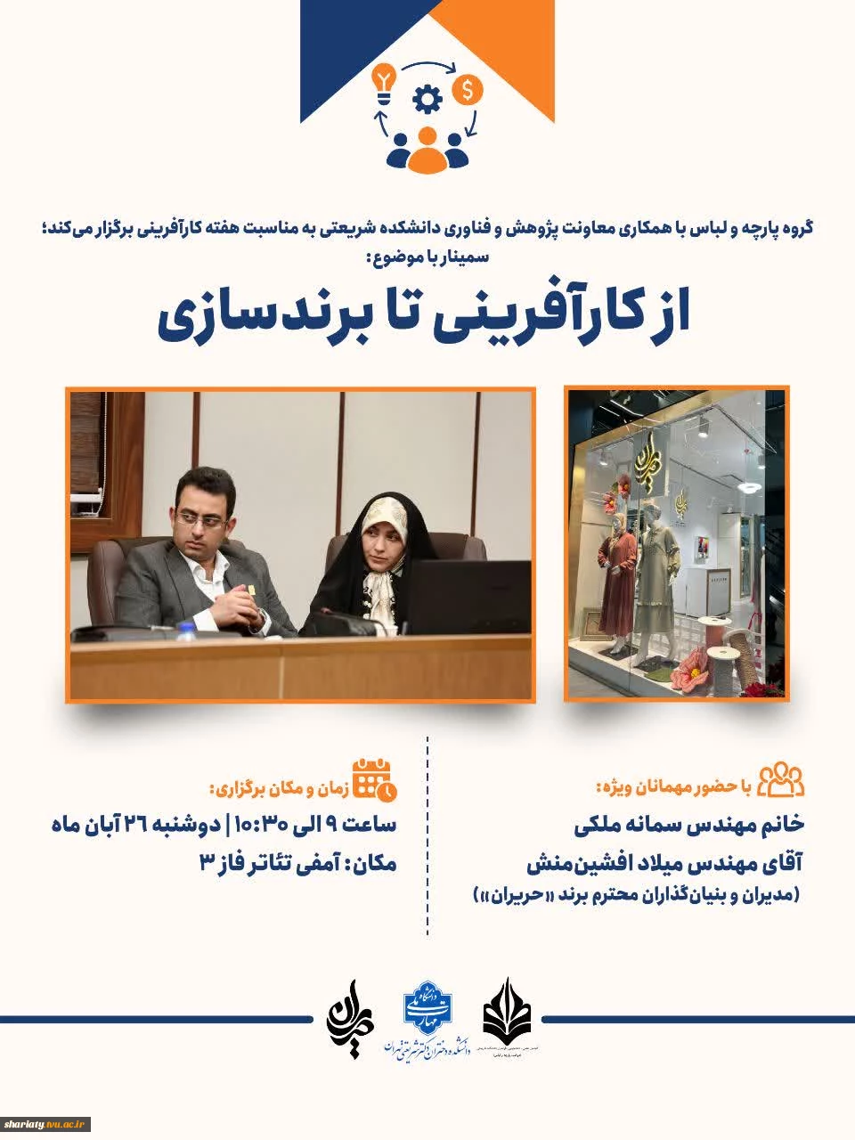 امتیاز دهید : گروه پارچه و لباس با همکاری معاونت پژوهش و فناوری دانشکده شریعتی به مناسب هفته کارآفرینی برگزار میکند: سمینار تخصصی «از کارآفرینی تا برندسازی» 2 شنبه 24 آبان 1404 ساعت 14:50